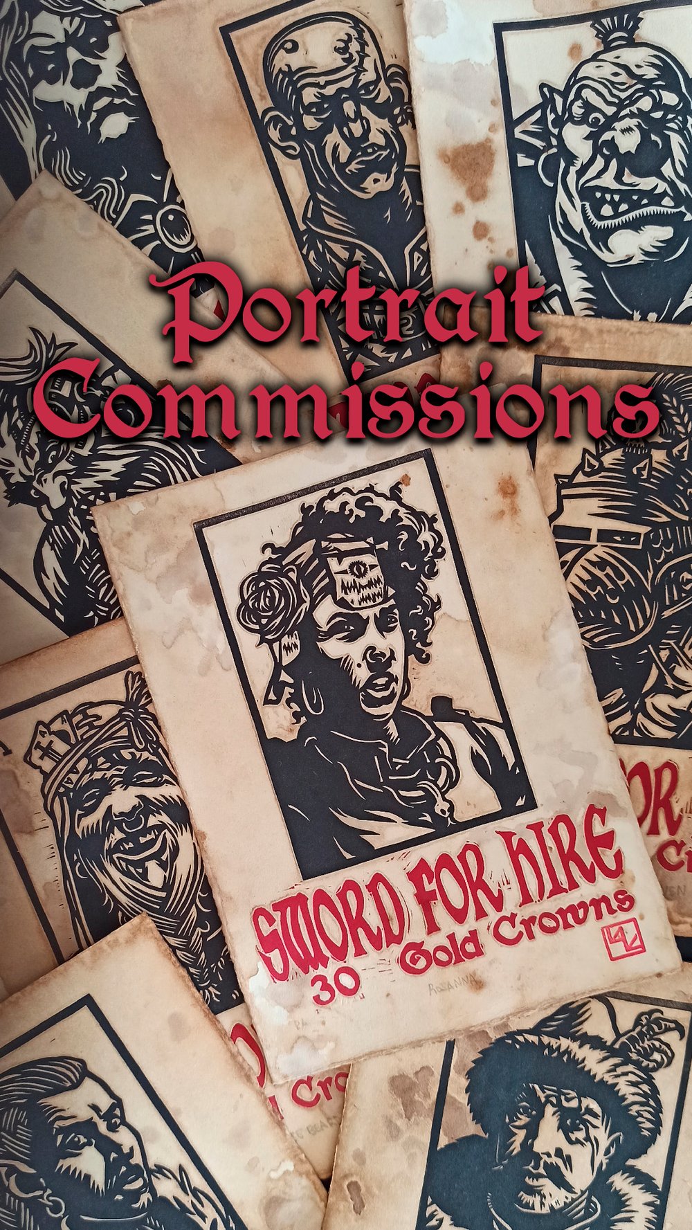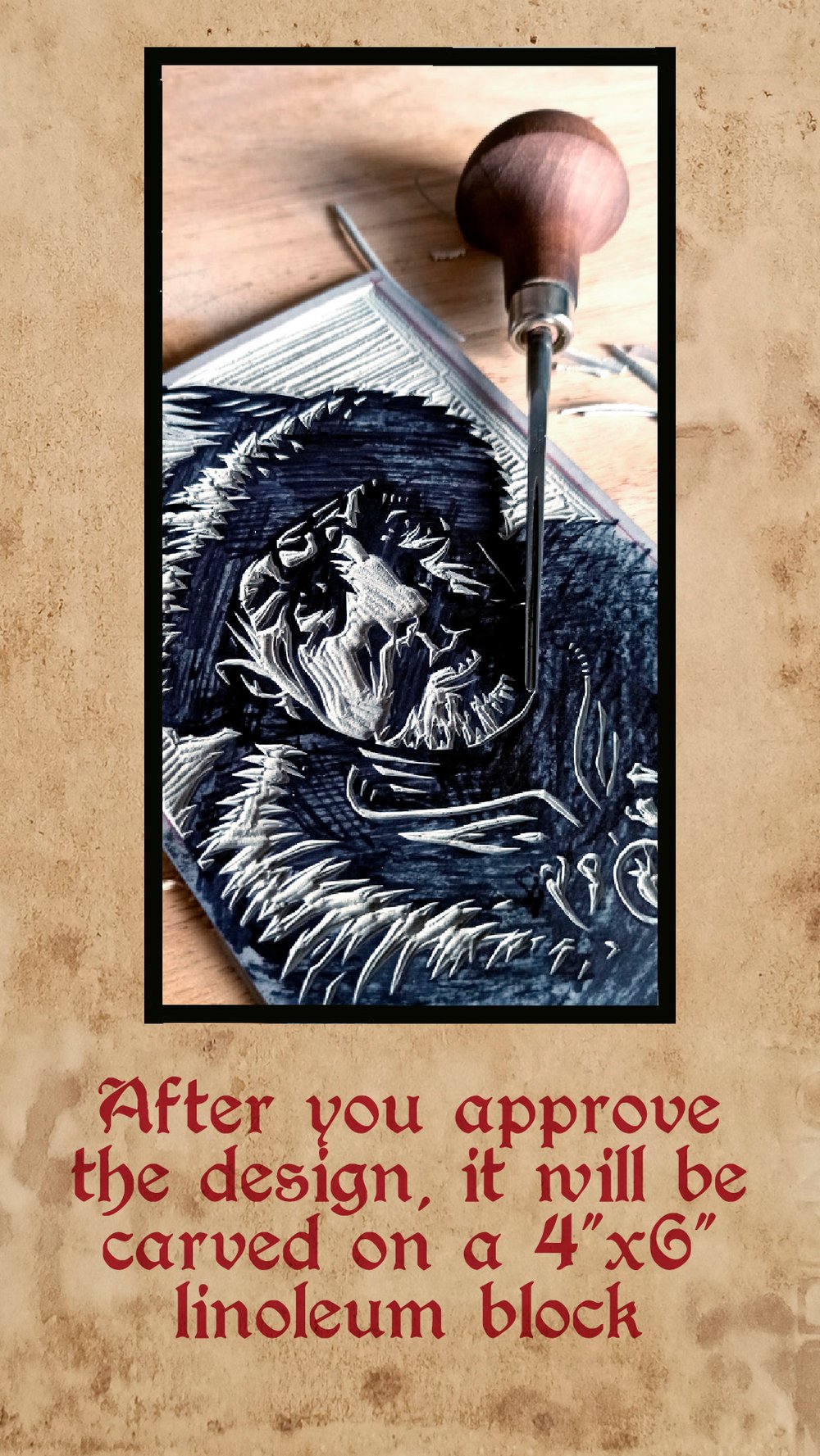 After you approve the concept I design I will carve your portrait on a 4”x6” linoleum block. This will be printed along with the “sword for hire” sign on 7”x10” high percent cotton archival paper, with an optional aging effect.