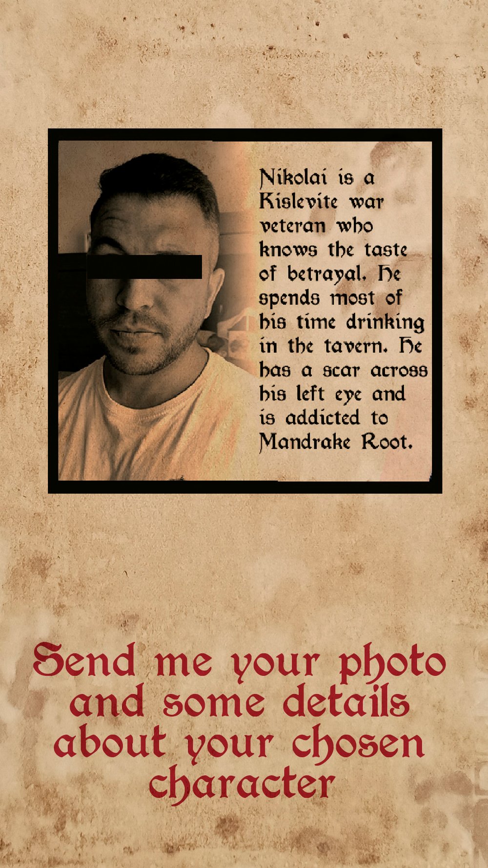 Send me a picture, your name and an optional couple of lines about your character’s story.