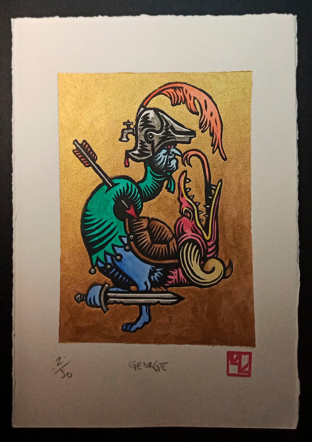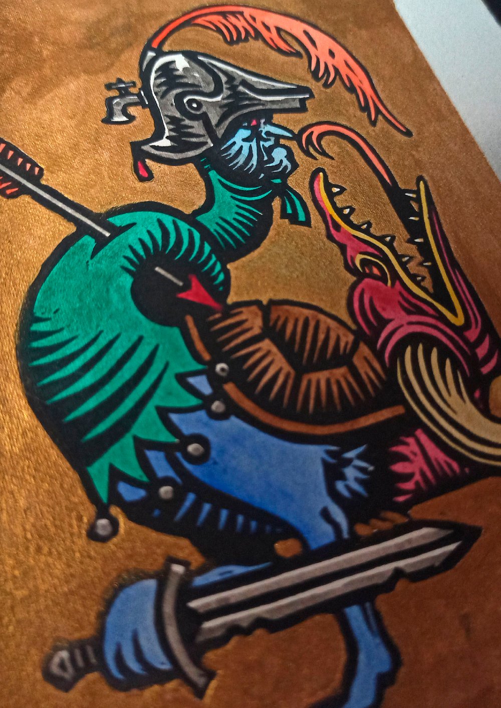 Medieval Marginalia inspired carving depicting the battle between Saint George and the Dragon.