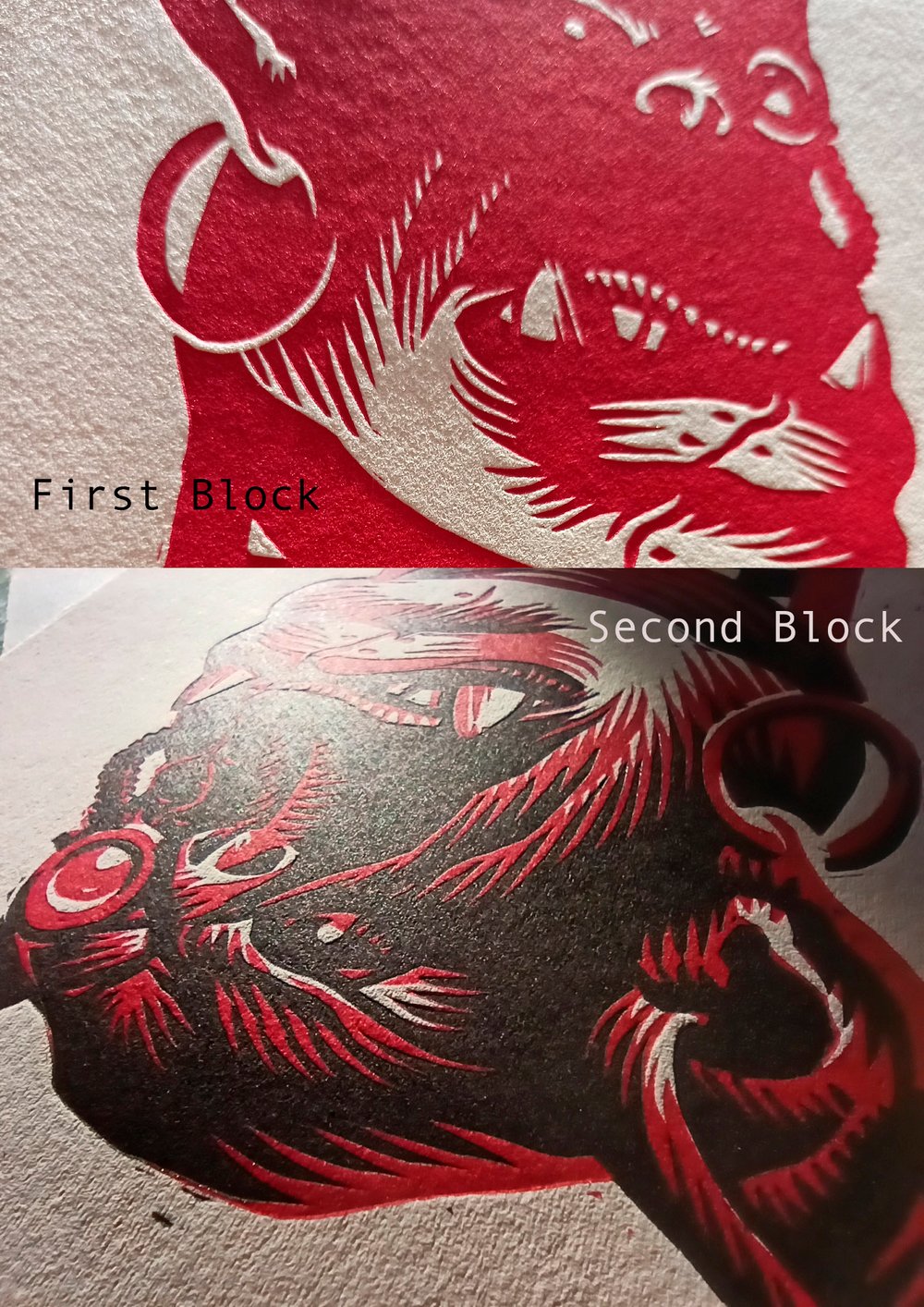 Multi-block linoleum carved print on high percent cotton archival mouldmade paper.